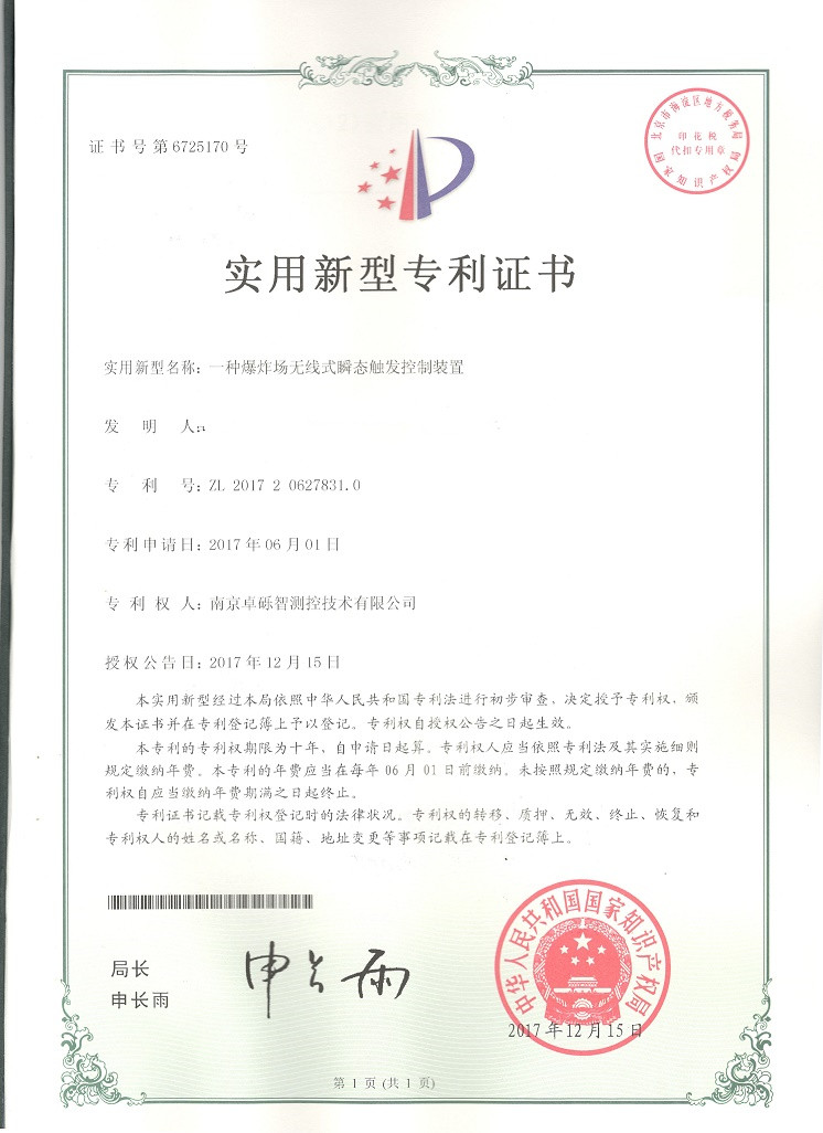 【实用新型专利证书】一种爆炸场无线式瞬态触发控制装置